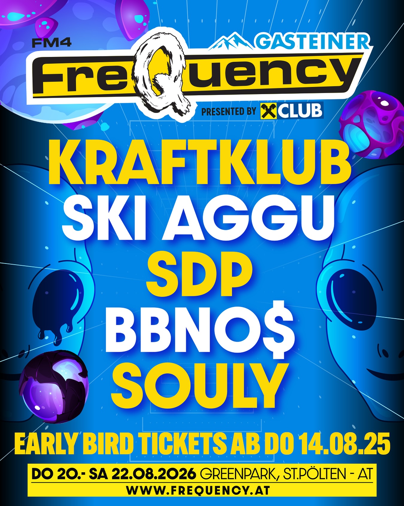 Als erster großer Headliner ist Kraftklub bestätigt. Die fünfköpfige Rap-Rock-Band aus Chemnitz kehrt nach ihrem gefeierten Auftritt 2023 zurück nach St. Pölten. Ebenfalls wieder am Start: Ski Aggu und Souly, die 2024 das Publikum zum Kochen brachten, sowie das Berliner Kult-Duo SDP, das zuletzt 2015 am Frequency für Hits und Party-Stimmung sorgte.